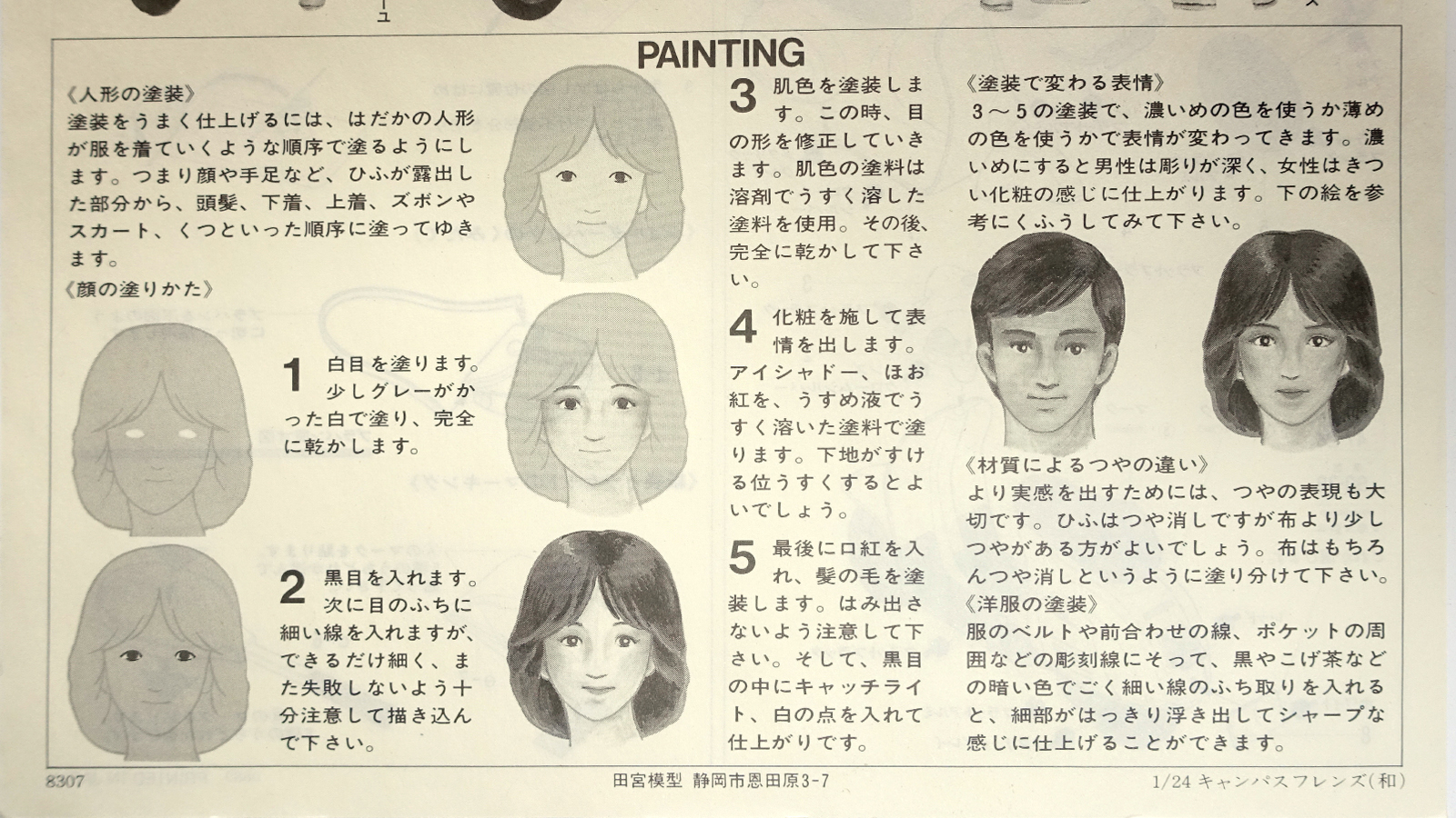 1983년에 나온 제품에도 있는 얼굴 색칠 가이드에는 여자 얼굴로 다섯 단계로 설명하고 있다.