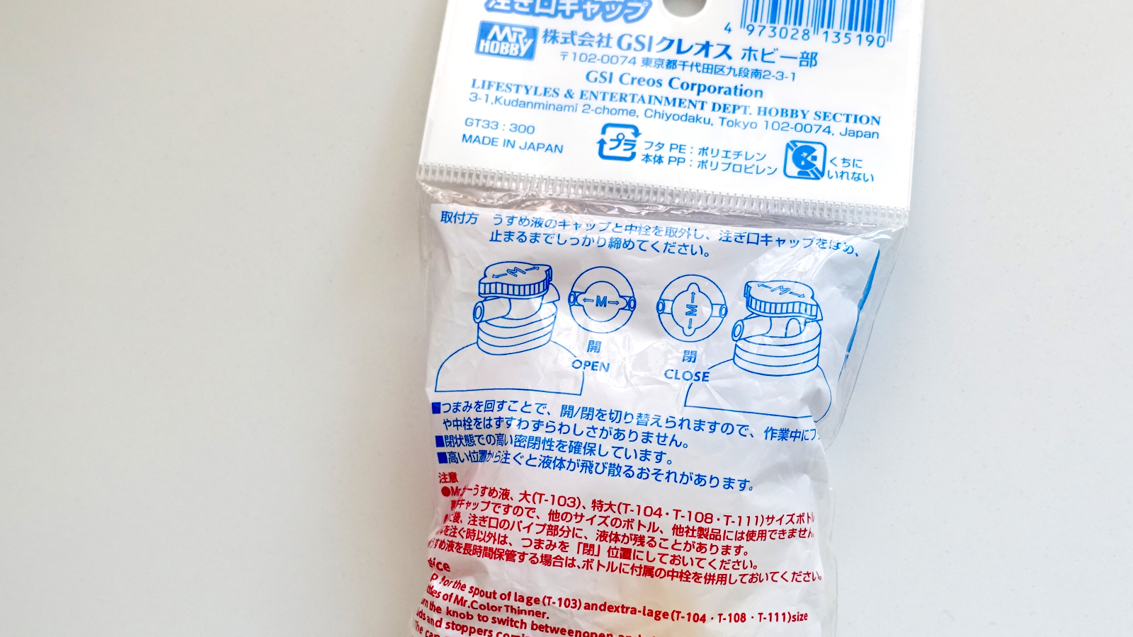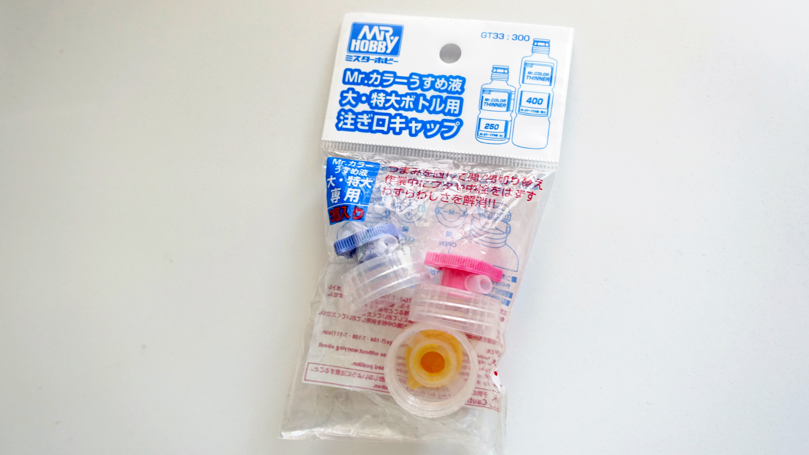 うすめ液 大・特大ボトル用 Mr.注ぎ口キャップ(3個入) 価格:300円 / 330円(税込) Mr.うすめ液 大・特大のボトル用の注ぎ口です。塗料皿やビンに移す際のタレを防ぎます。また、閉状態で