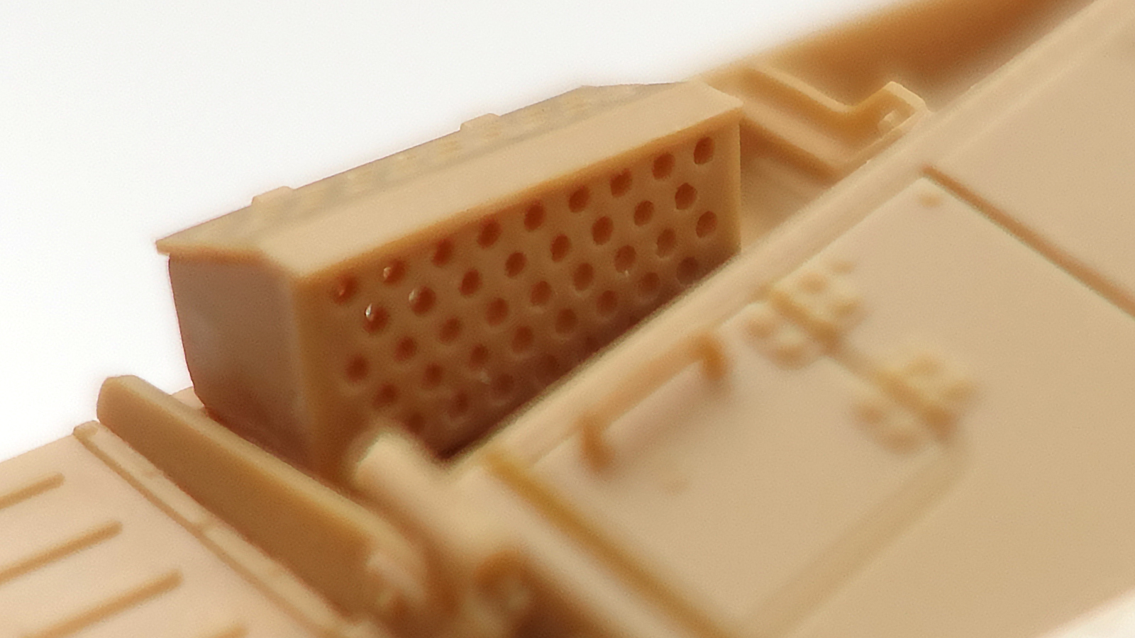표면 질감 내느라 갈아버린 돌기물을 복원시키는 걸 깜빡하다니. (사진에 민트색 블록, 주포 마스크 스토퍼인 듯)