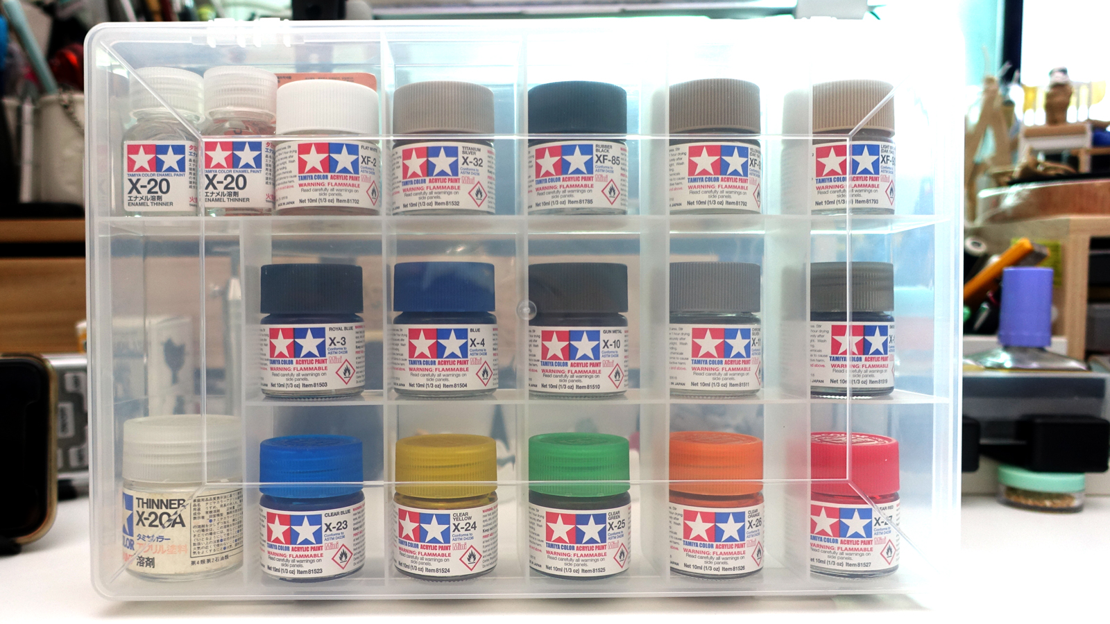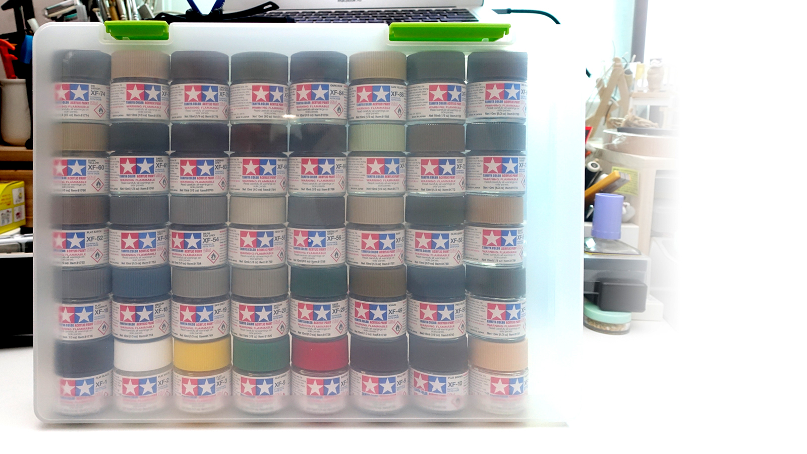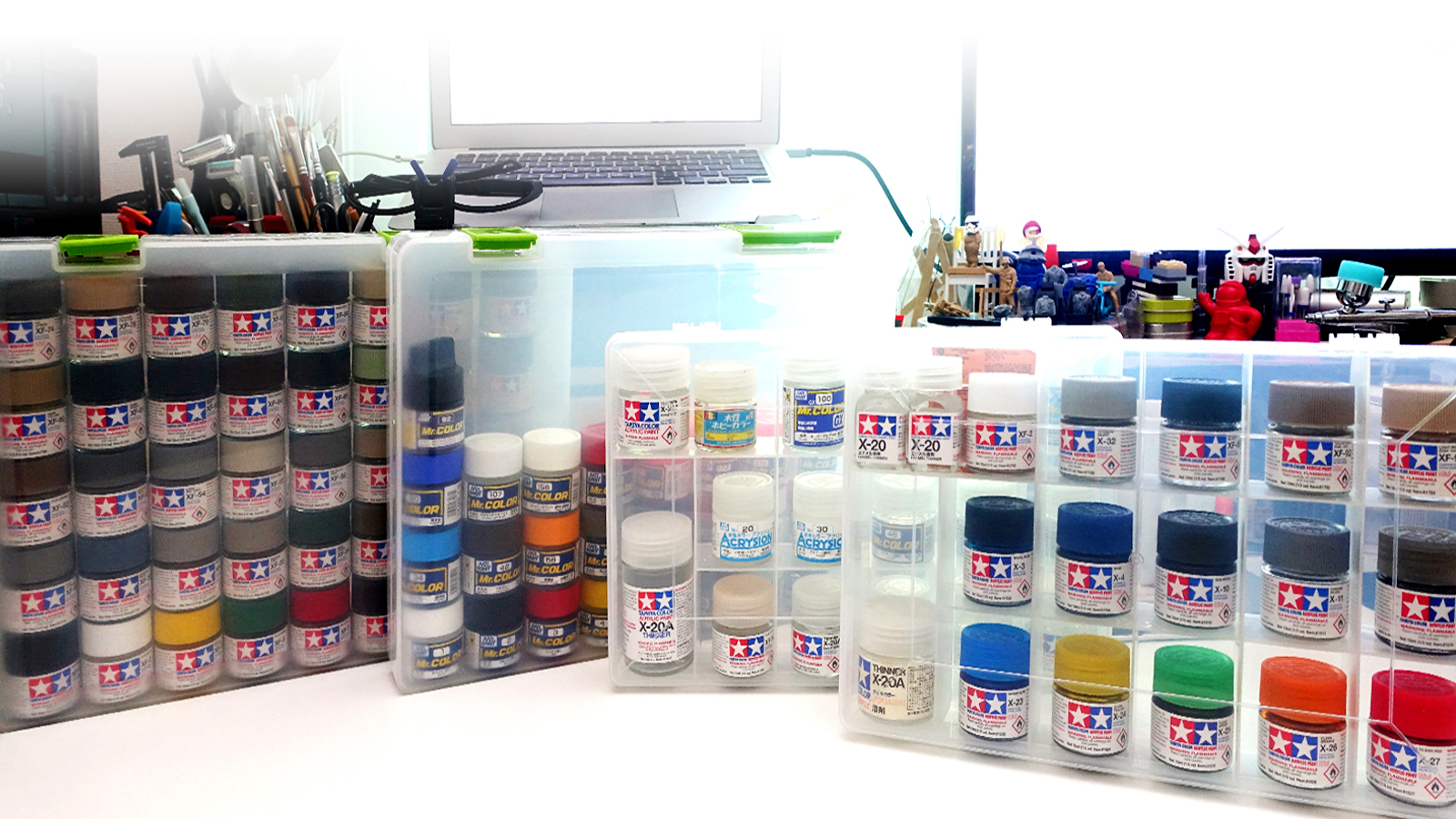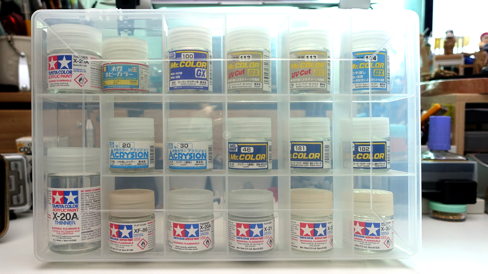 机の上や、適当なダンボールに放り込まれた塗料たちに僕は頭を抱えていました。特に最近はGSIクレオスの水性ホビ…
