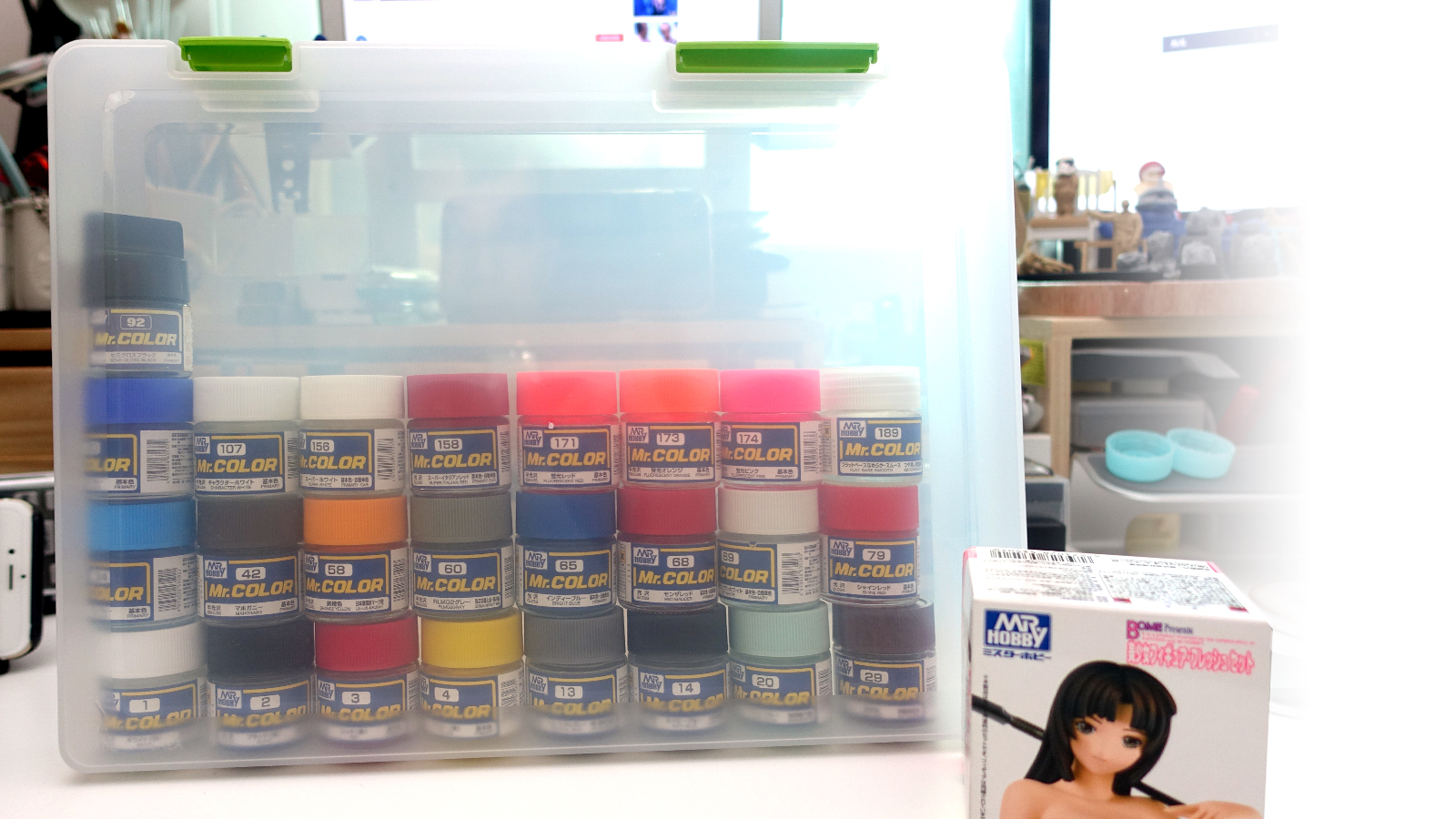 앞쪽에 따로 보이는 미소녀 피겨 플레시 세트(CS551)는 유명 작가 보메(ポメ) 선생이 소속된 카이요도와 콜라보한 Mr. Hobby의 물감 4종 세트입니다.